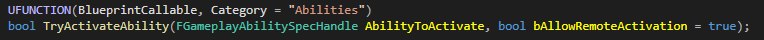 LocalPredicted 옵션에서 PC가 Server 측에서 GameplayAbility를 실행하더라도 TryActivateAbility 함수 내부에서 Client RPC를 통해 Client에서 실행하도록 처리합니다. 단, TryActivateAbility의 bAllowRemoteActivation 변수를 Default값 true인 채로 호출했을 때입니다. 만약 bAllowRemoteActivation 값을 false로 세팅했다면 TryActivateAbility는 Ability 실행 자체를 실패합니다.