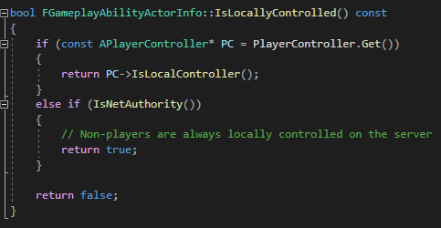 코드 상, NPC들의 경우 Net Authority를 가지고 있을 때 Local 이라고 판단합니다. 간단하게 보면 Dedicated Server 환경에서 PC는 Client 때, NPC는 Server일 때 Local이라고 판단됩니다.