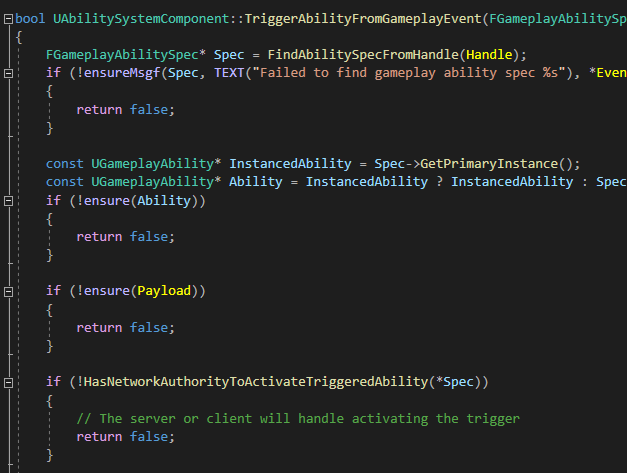 ASC에는 GameplayEvent에 따라 실행할 GameplayAbility에 대해서는 일반적인 TryActivateAbility() 와는 다른 방식으로 실행합니다. TriggerAbilityFromGameplayEvent() 함수 내부에서는 HasNetworkAuthorityToActivateTriggeredAbility()를 통해서 어빌리티를 실행시키려는 환경이 Authoirty를 갖고 있는지 확인합니다. Authority를 갖고 있는지 여부는 GameplayAbility의 Execution Policy를 통해 판단합니다.