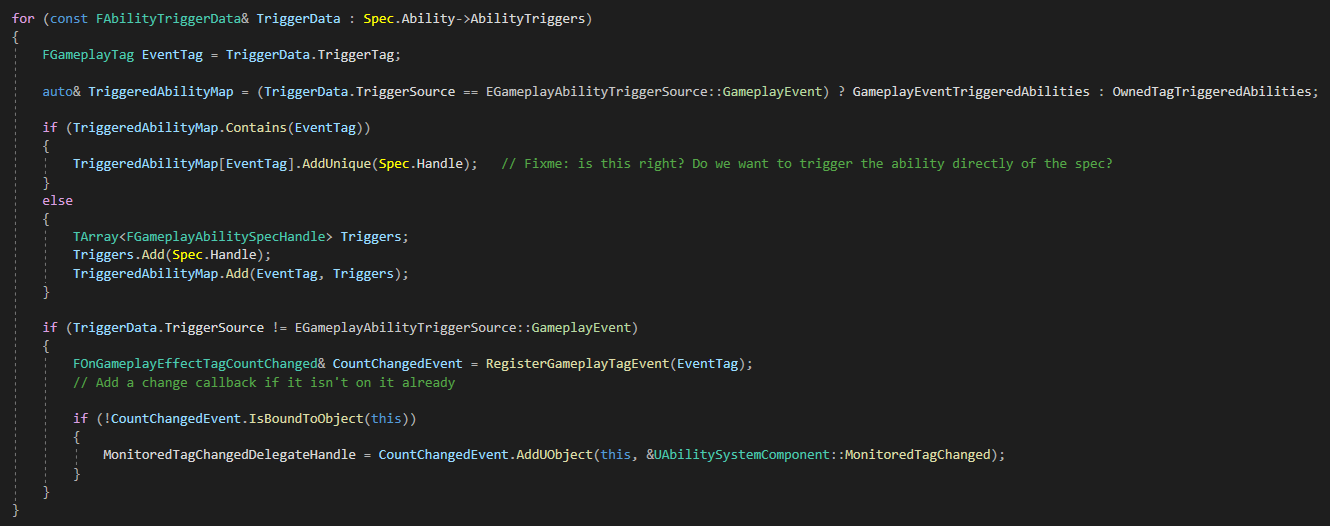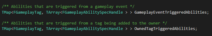 코드를 보면 추가되는 GameplayAbility의 AbilityTriggers들을 검사하고 적절한 Map에 데이터를 저장하는 것을 볼 수 있습니다. TriggerSource 타입에 따라 GameplayEventTriggeredAbilities와 OwnedTagTriggeredAbilities에 저장됩니다.