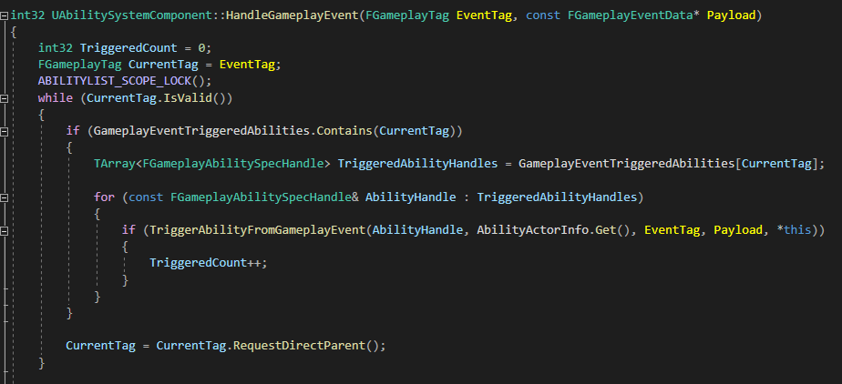 해당 함수의 일부 코드를 보면 OnGiveAbility() 함수에서 Trigger 정보를 저장해둔 GameplayEventTriggeredAbilities 변수를 이용하고 있습니다. 이벤트로 넘어온 Tag에 반응하는 어빌리티가 있다면 TriggerAbilityFromGameplayEvent() 함수를 호출합니다. 주의할 점은 Event Tag의 Parent까지 돌면서 찾는다는 것입니다.