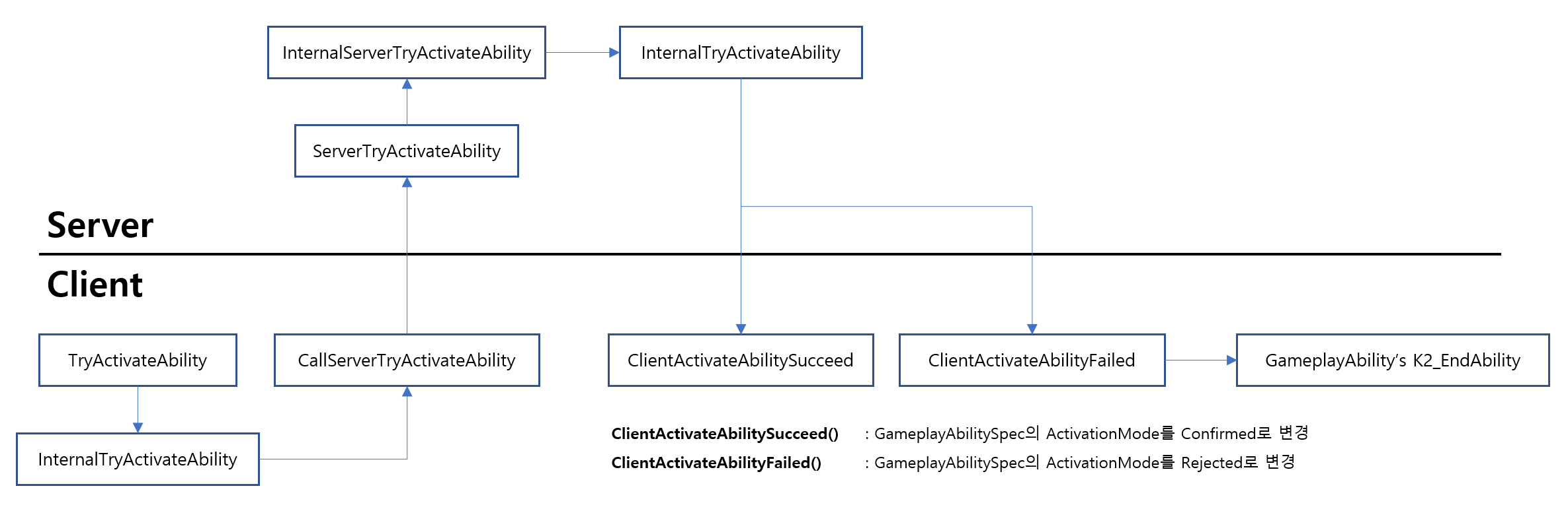 마지막 K2_EndAbility 함수를 제외한 모든 함수는 AbilitySystemComponent 내부 함수입니다. TryActivateAbility 함수만 호출해주면 내부적으로 서버 - 클라 간의 통신들이 모두 수행됩니다. 단, 클라이언트에서 서버의 어빌리티 실행의 성공을 예상하고 실행하는 것이기 때문에 서버에서 실패했을 때의 처리는 해주어야 합니다. 클라이언트에서 이미 실행해버린 몽타주, GameplayCue 등이 그 예입니다.